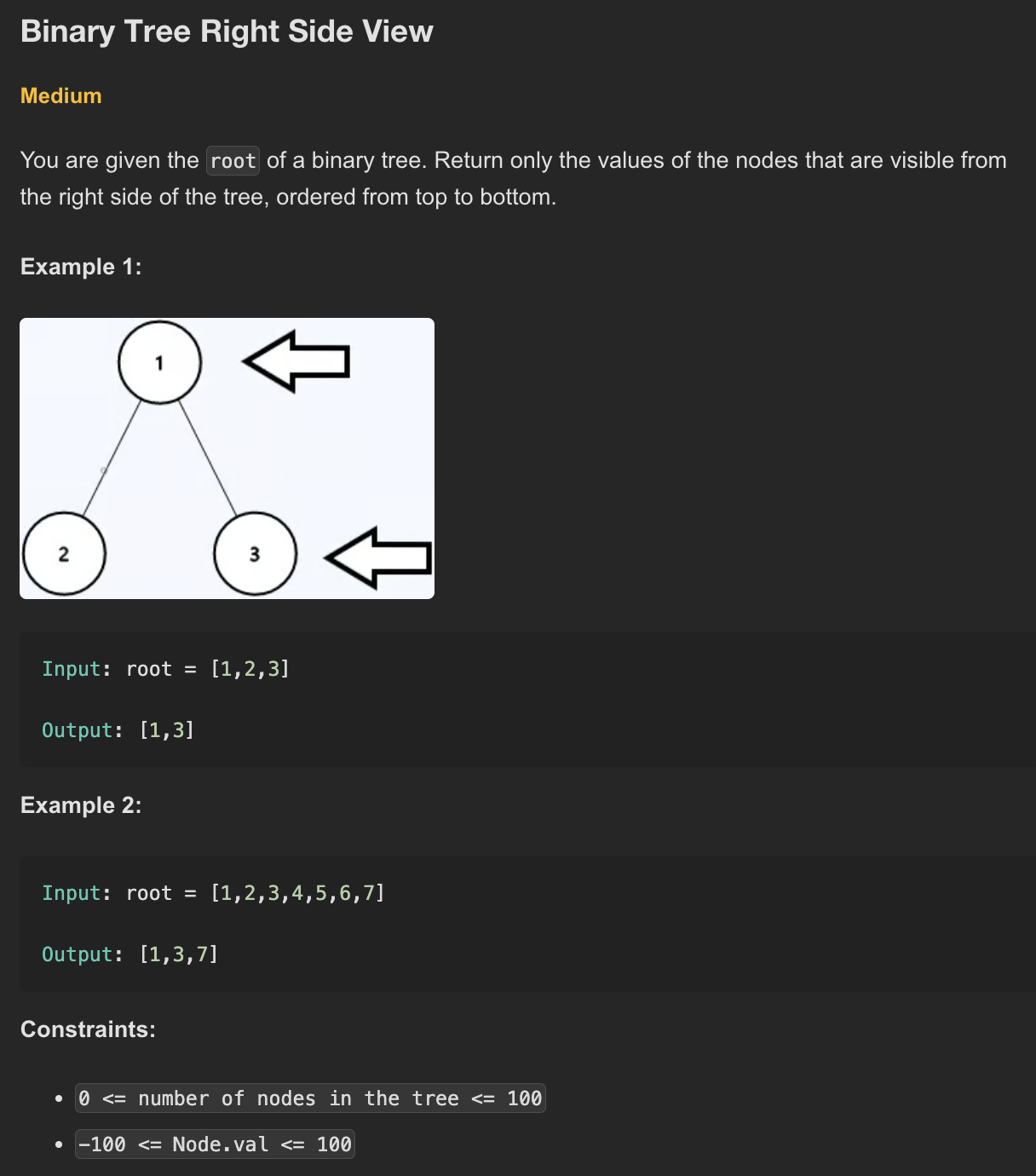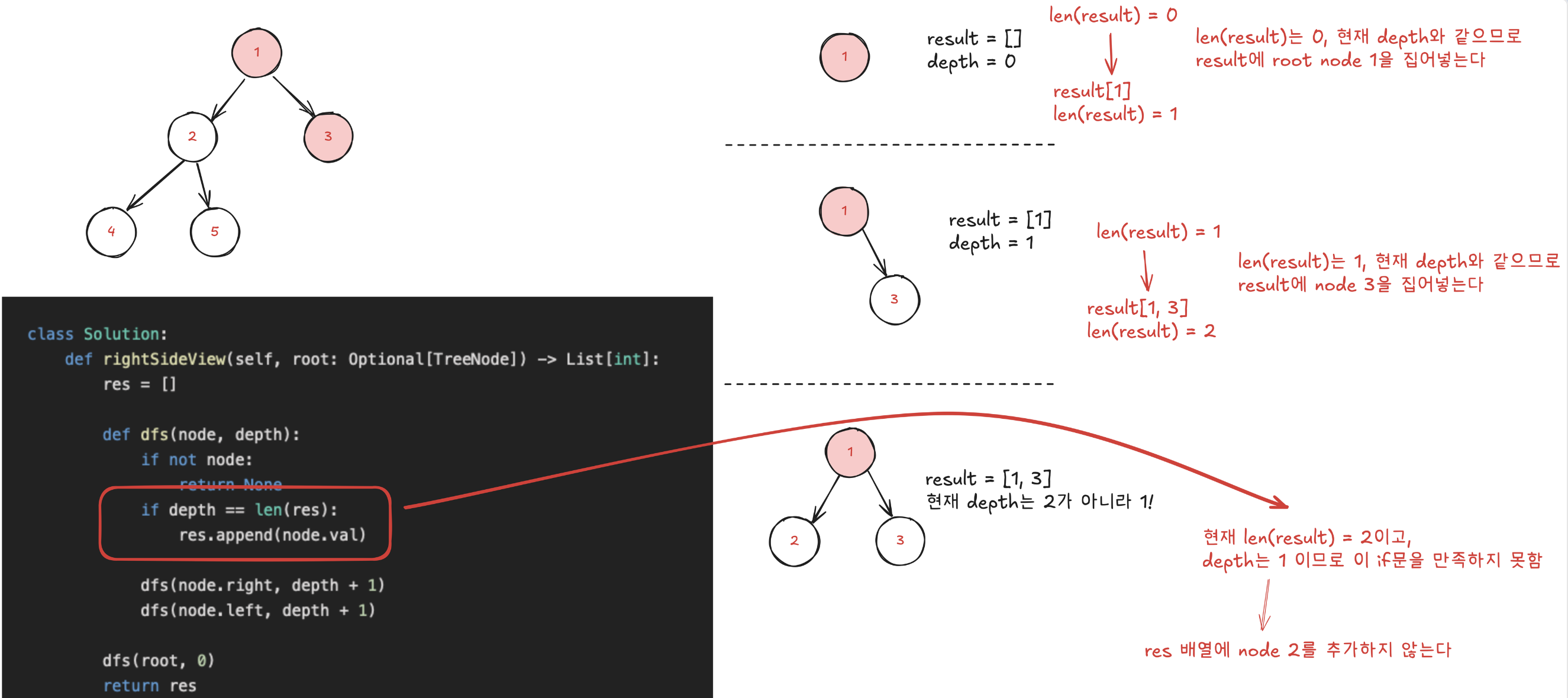- DFS를 사용할 경우, 각 깊이에서 처음 방문한 노드가 바로 오른쪽 노드이다. 따라서 이를 결과 리스트에 추가한다.